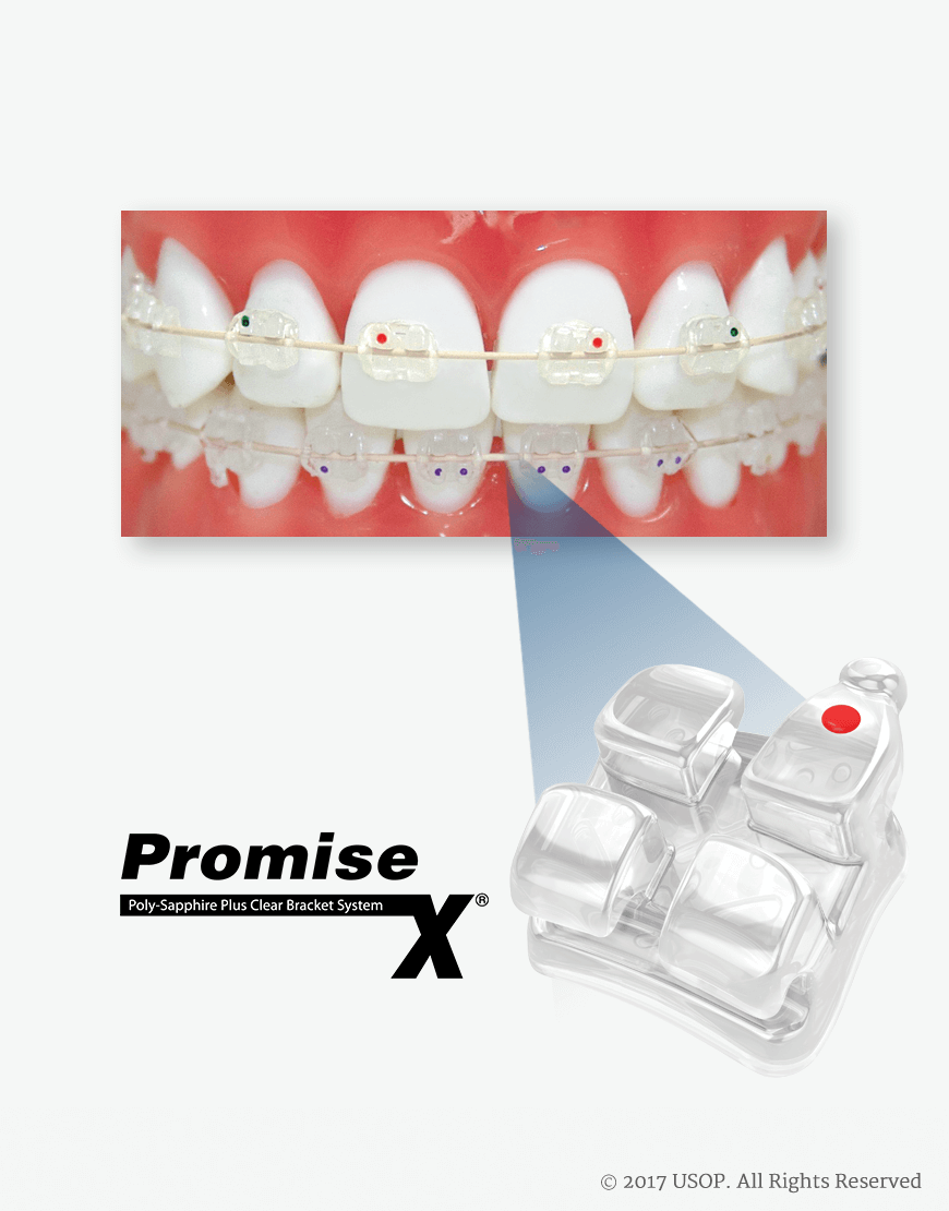 Promise X® has a fully transparent body and any light absorption creates a unique translucent color. The poly-sapphire plus ceramic material gives the bracket a high level of strength, smooth surfaces, and fracture resistance. Having your patient’s comfort in mind, the Promise X was developed with one of the lowest profiles of any bracket systems in the industry. The triple X mechanical lock base significantly increases bonding strength, while allowing easy de-bonding. You can purchase brackets individually or in full sets.